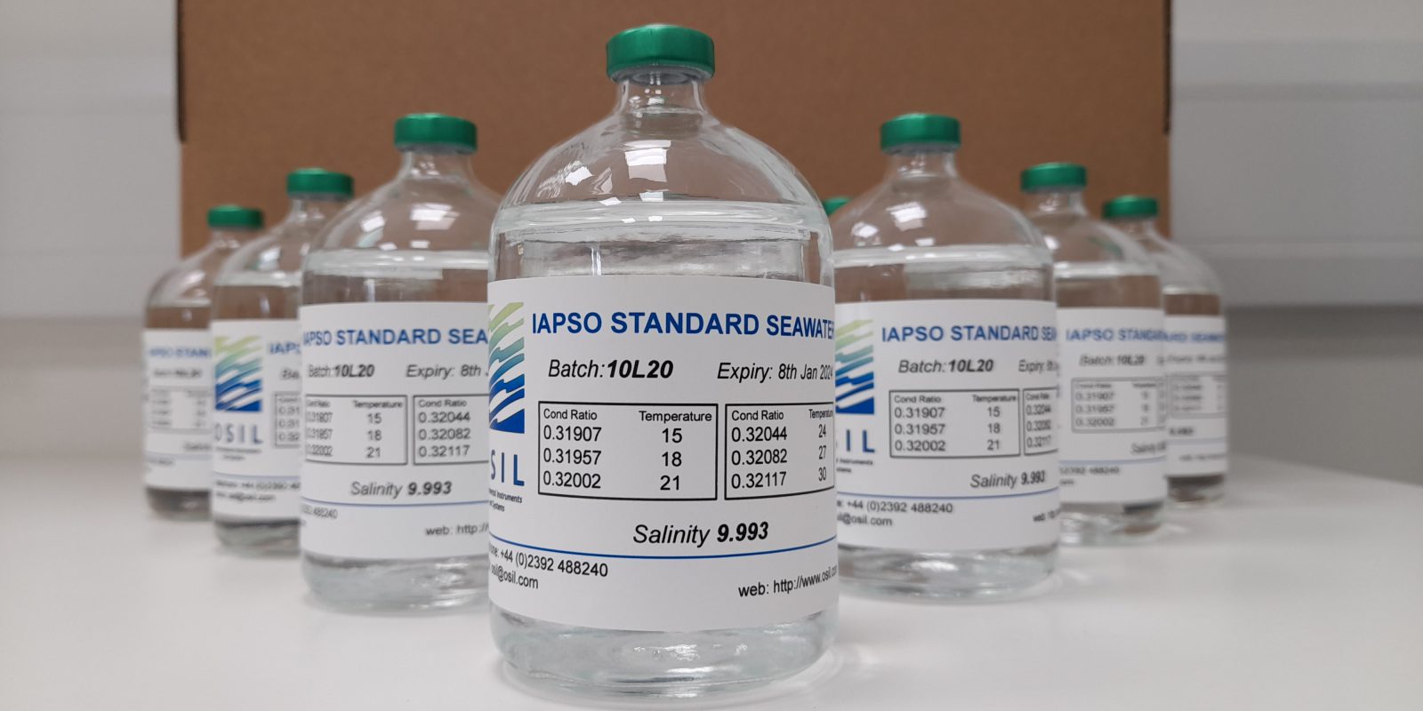 IAPSO Standard Seawater is available in high quality, crimp sealed glass bottles, each containing ca.200 ml of natural seawater. Each bottle’s label carries information on its conductivity ratio (K15) and salinity according to the Practical Salinity Scale 1978 (PSS78).
